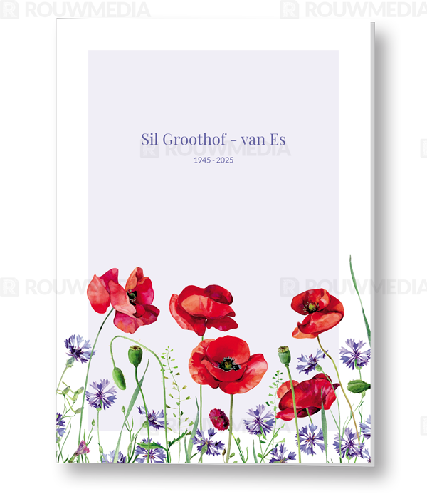 Deze staande rouwkaart toont enkele veldbloemen met de kleur paars erin verwerkt.