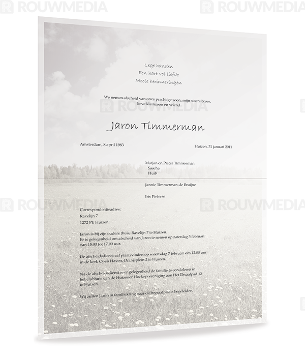 In deze rouwbrief is het hollandse landschap weergegeven door zijn mooie rustgevende weiland te tonen met weidebloemen.