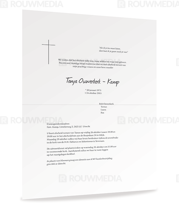In deze rouwbrief is een minimalistische en traditionele stijl toegepast. Ook wordt er linksboven een kruis weergegeven.