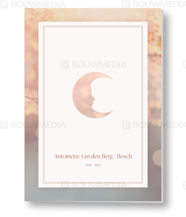 In deze rouwkaart wordt een afbeelding weergegeven van bloesem en een silhouet van de maan. Daarnaast is het mogelijk om de naam, data en gedicht/citaat weer te geven.