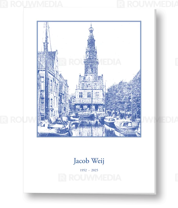 In deze recht staande kaart wordt een afbeelding weergegeven een tekening met pen van de Waag Alkmaar. Daarnaast is het mogelijk om de naam, data en gedicht/citaat weer te geven.