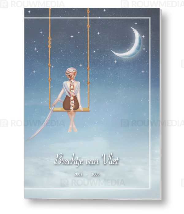 Rouwkaart met een meisje op de schommel in de lucht boven de wolken met een maan. Aan de binnenkant kan een foto geplaatst worden.