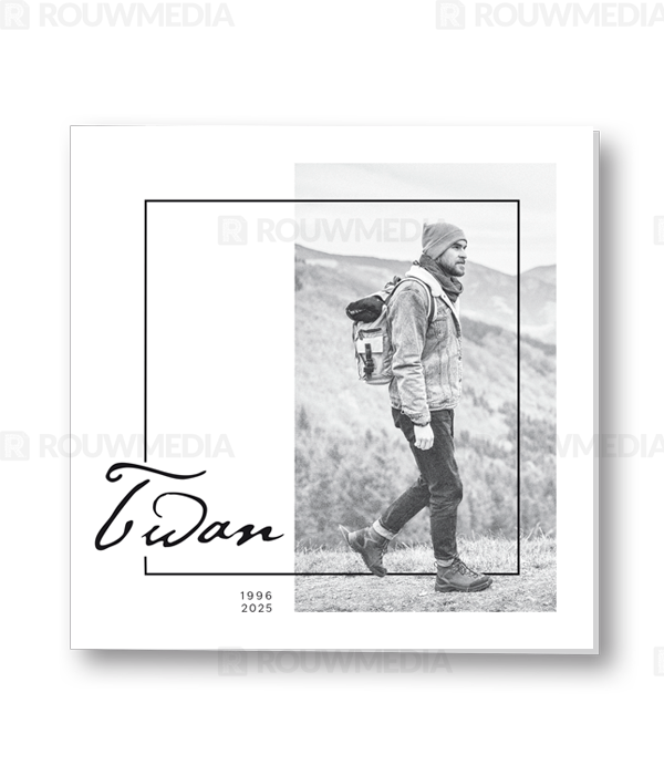 Op deze rouwkaart kunt u een eigen foto plaatsen en wordt de naam in het kader geplaatst