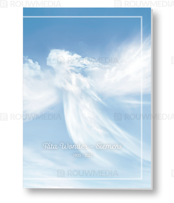 In de staande rouwkaart wordt een beeldvullende foto weergegeven van een engel die gemaakt is uit een wolk.