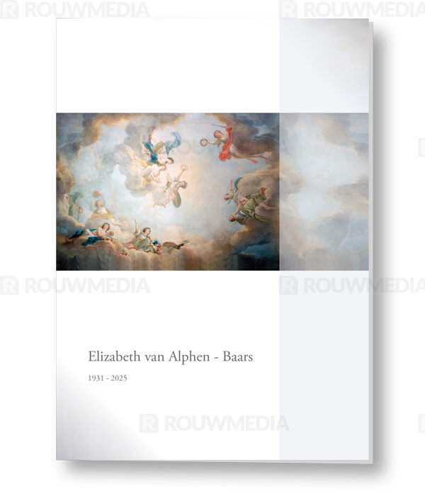 Rouwkaart met afbeelding van engelen. Aan de rechterkant wordt een transparante balk weergegeven om de kaart wat meer kleur te geven en speelser te maken.