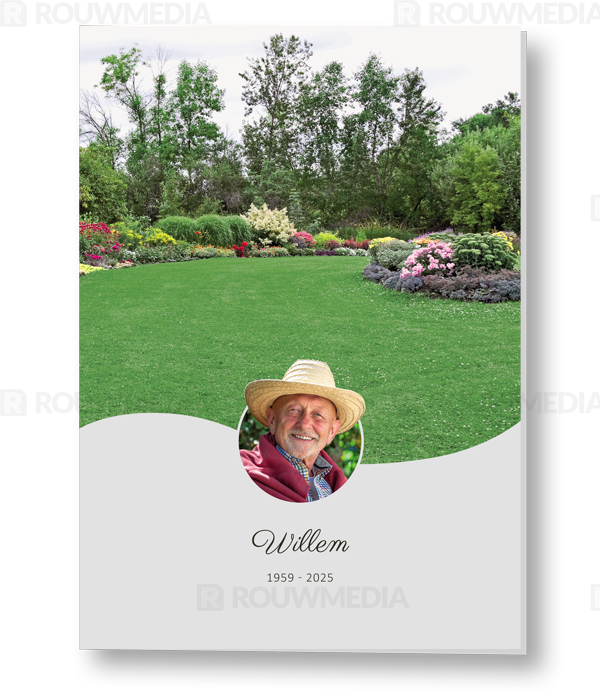 In deze staande rouwkaart wordt een beeldvullende afbeelding weergegeven van een tuin. Onder de afbeelding kunt u een portret of foto, de naam en datums weergeven.
