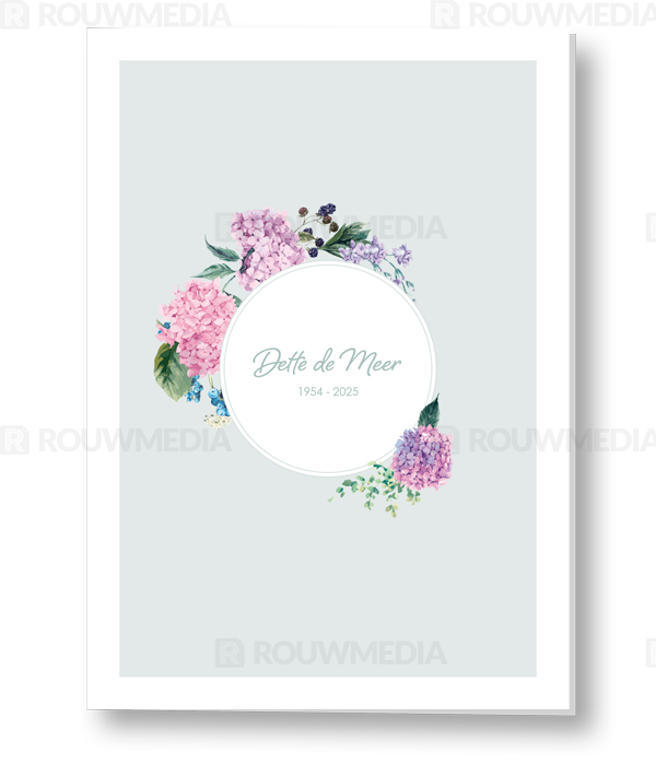 In deze rouwkaart wordt de naam en datums van de overledenen centraal gezet. Door een ronde cirkel met vleurige hortensias wordt de naam extra geaccentueerd.