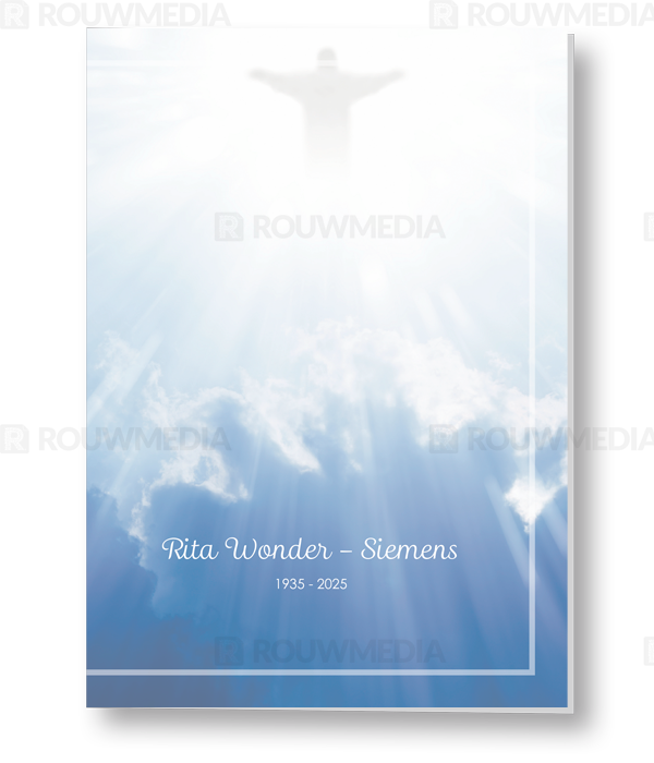 In de staande rouwkaart wordt een beeldvullende foto weergegeven van jezus die boven de wolken uitsteekt.