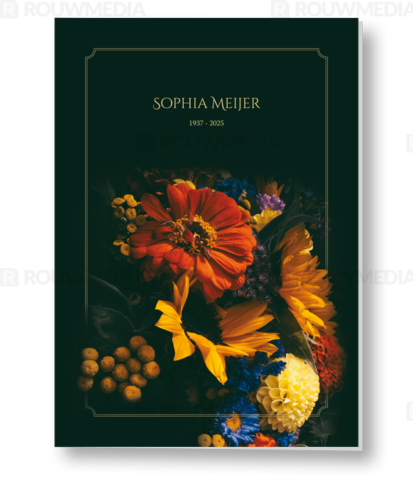Op deze kaart wordt een kleurrijk boeket weergegeven op een zwarte achtergrond, met een dubbel, omgekeerd kader.