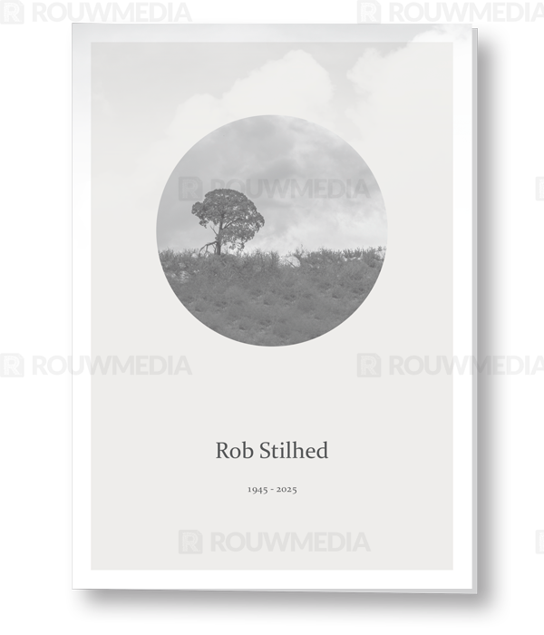 Bij deze rouwkaart wordt het landschap in een grote cirkel weergegeven. Daarnaast is er ruimte voor een portret of afbeelding links weer te geven.