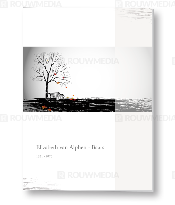 Rouwkaart met mogelijkheid om eigen portret/afbeelding weer te geven in langwerpige balk. Aan de rechterkant wordt een transparante balk weergegeven om de kaart wat meer kleur te geven en speelser te maken.