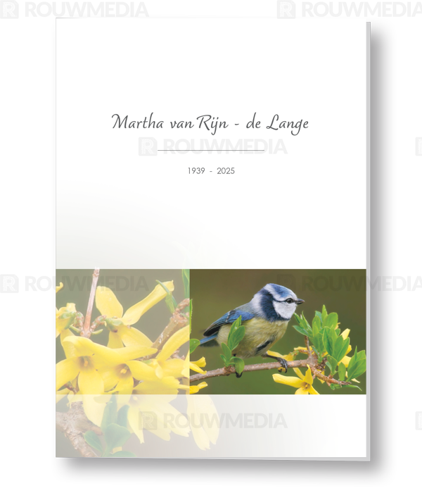 Op deze staande rouwkaart wordt een koolmeesje op een tak weergegeven. Daarboven is het mogelijk om een naam met datums weer te geven.