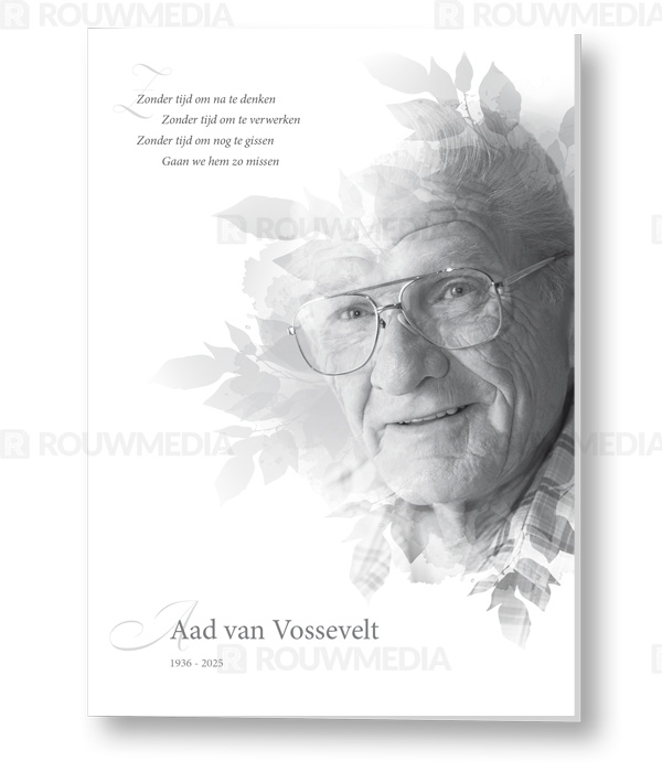 In deze staande rouwkaart kunt u een portret of afbeelding weergeven. Deze wordt geplaatst in een silhouette van bloeemen. In de overige witruimte kunt u de naam, datum en gedicht of citaat tonen.