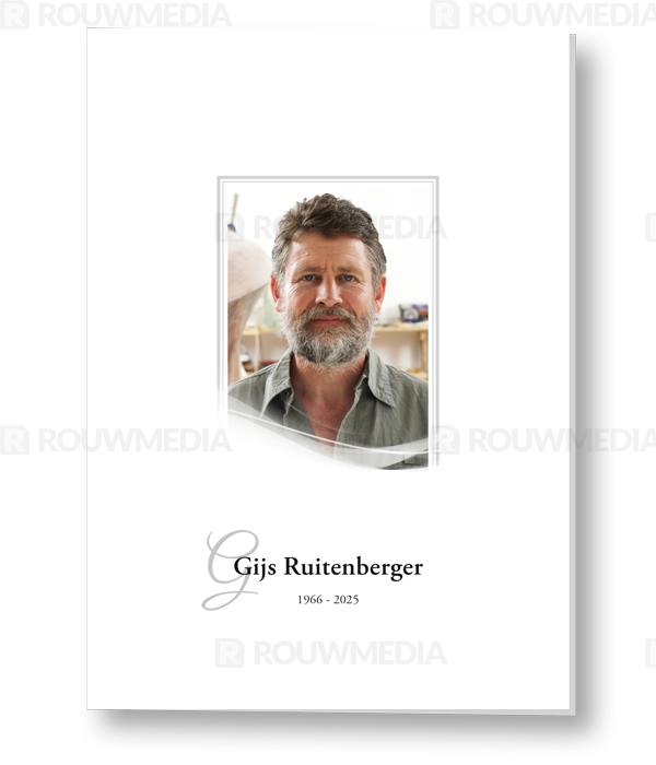 Voor deze staande rouwkaart kunt u een portret of afbeelding op de kaart weergeven. Onderin de kaart is er ruimte om de naam en datum te tonen.
