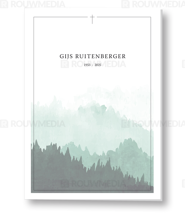 In deze staande rouwkaart is een aquarel met zwart/witte vlekken weergegeven. De focus binnen deze kaart ligt op de geschilderde/aquarel stijl. Daarnaast is het ook mogelijk om de naam en datums te tonen.