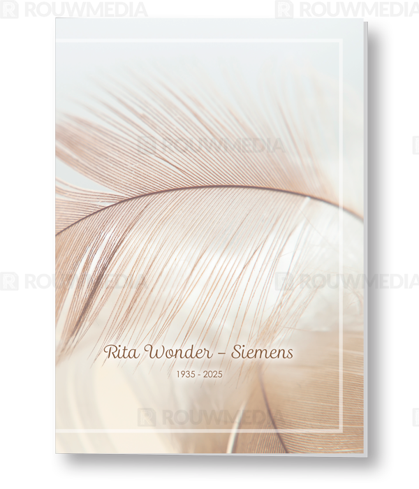 In de staande rouwkaart wordt een beeldvullende foto weergegeven van een bruine veer.