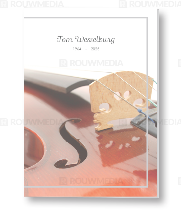 In de staande rouwkaart wordt een beeldvullende foto weergegeven van een viool.