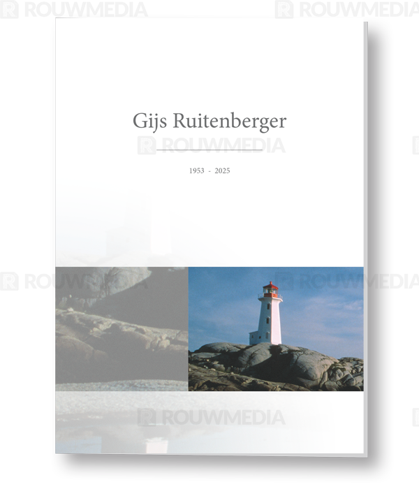 Op deze staande rouwkaart wordt een vuurtoren weergegeven. Daarboven is het mogelijk om een naam met datums weer te geven.