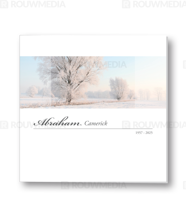 In deze vierkante rouwkaart wordt een horizontale afbeelding weergegeven van een winters landschap.