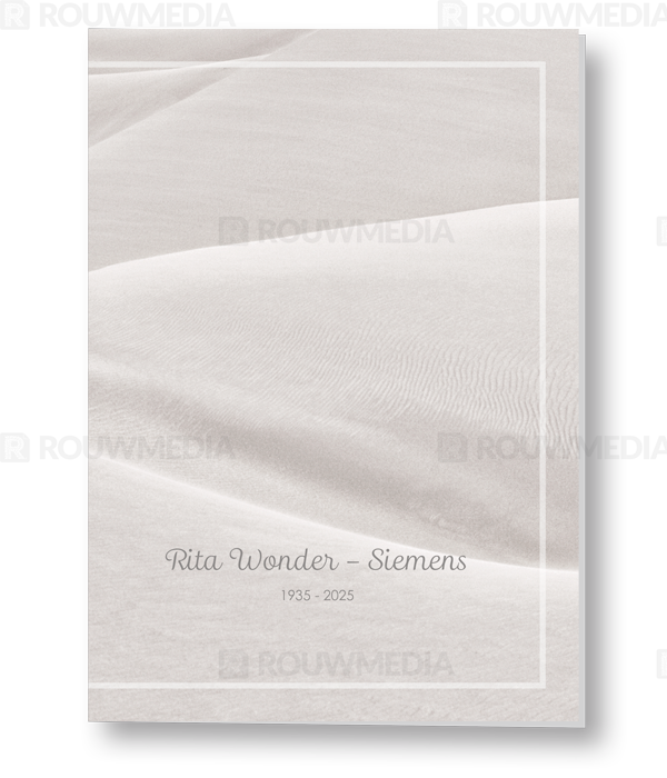 In de staande rouwkaart wordt een beeldvullende foto weergegeven van zandheuvels.